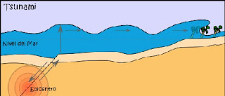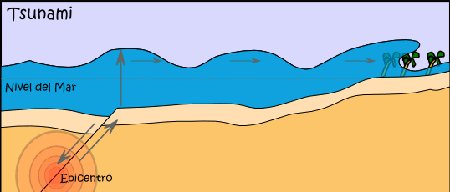 Apreciamos en el dibujo de arriba la representación estándar de un tsunami, para que veas cómo se producen los maremotos desde el epicentro a la costa.