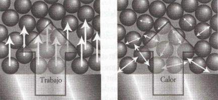 Existe un equivalente entre trabajo y calor. Aun así, son cosas diferentes. Para empezar, existen calentadores y no trabajadores. Cuando levantamos un bloque hacemos trabajo sobre él. Todos los átomos se moverán en la misma dirección y sentido de manera uniforme. Lo mismo sucede al comprimir o estirar u muelle. Por tanto, el trabajo es la transferencia de energía mediante el movimiento uniforme de los átomos en el medio.