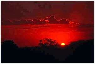 Al atardecer, el camino que la luz solar recorre dentro de la atmósfera es mas largo, los rebotes sucesivos en unas partículas y otras hacen crecer la probabilidad de que la luz acabe chocando con una partícula absorbente y desaparezca, de manera que incluso la parte amarilla es afectada y difundida y solo los rayos rojos, los más direccionales, siguen un camino casi rectilíneo. De ahí el color rojo del sol poniente.