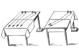 De una forma más reducida, nosotros podemos repetir esta representación gráfica de la refracción de la luz, en nuestra propia mesa. Para ello, una mitad de esta mesa se cubre con un mantel (fig. 109) y, después de inclinarla un poco, se hace que ruede por ella un par de ruedecitas fijas en un eje común (pueden servir las de cualquier juguete roto). Si la dirección en que se mueve este par de ruedas y la del borde del mantel forman entre sí un ángulo recto, el camino no se tuerce. En este caso tenemos una ilustración de la regla óptica que dice: Todo rayo de luz, perpendicular al plano de separación de dos medios diferentes, no se refracta. Pero si la dirección del movimiento de las ruedecitas está inclinada con respecto al borde del mantel, el camino que siguen aquéllas se tuerce al llegar a dicho borde, es decir, en la divisoria entre los dos medios que determinan la diferencia en la velocidad de las ruedecitas. No es difícil darse cuenta de que, al pasar de la parte de la mesa en que la velocidad del movimiento es mayor (la desprovista de mantel), a la parte en que dicha velocidad es menor (la cubierta por el mantel), la dirección del camino (del "rayo") tiende a aproximarse a la "perpendicular de incidencia". En el caso contrario, se observa una tendencia a separarse de dicha perpendicular.