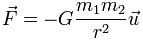 donde F es la fuerza, G es una constante que determina la intensidad de la fuerza y que sería medida años más tarde por Henry Cavendish en su célebre experimento de la balanza de torsión, m1 y m2 son las masas de dos cuerpos que se atraen entre sí y r es la distancia entre ambos cuerpos, siendo el vector unitario que indica la dirección del movimiento (si bien existe cierta polémica acerca de que Cavendish hubiera medido realmente G, pues algunos estudiosos afirman que simplemente midió la masa terrestre).